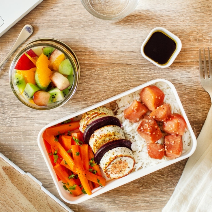 Place all the ingredients in a bento box with the carrot sticks on one side. Then place the goat cheese medallions and the beet slices, alternating one after the other.